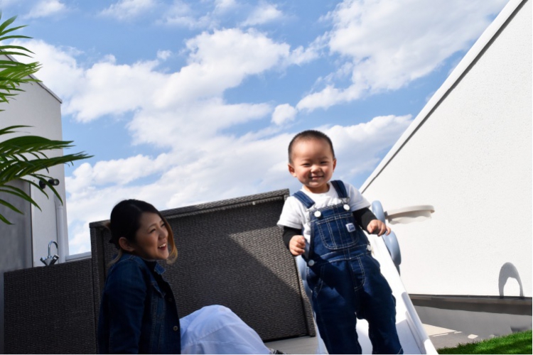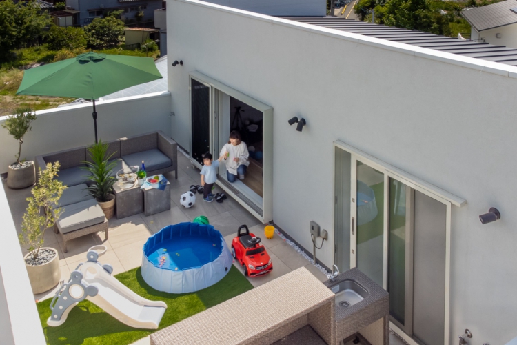 目の前に空が広がる開放感と人の目を気にしないプライベート感。子どもを空の下でのびのび遊ばせられる安心感。